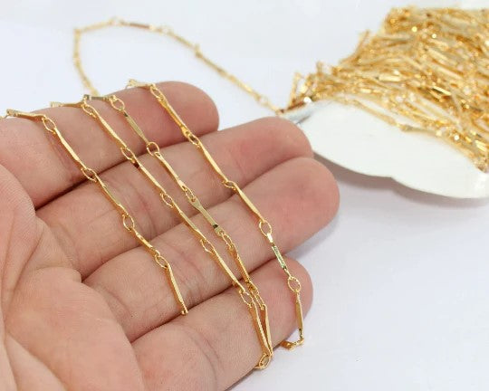 24 Carat Gold Plated Soldered Bar Chain. Dimensions: 1x11mm PRICE FOR 1 METER. 24 carat gold plated on brass. A Quality product resistant to rust and tarnishing. Do not contact with chemicals and perfumes for long-term use. Passed all tests does not contain harmful materials. Colors may vary depending on screen settings and ambient light.