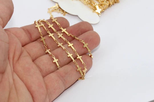 24 Carat Gold Plated Cross Chain. Dimensions: 5x13mm PRICE FOR 1 METER. 24 Carat gold plated on brass. A Quality product resistant to rust and tarnishing. Do not contact with chemicals and perfumes for long-term use. Passed all tests does not contain harmful materials. Colors may vary depending on screen settings and ambient light.