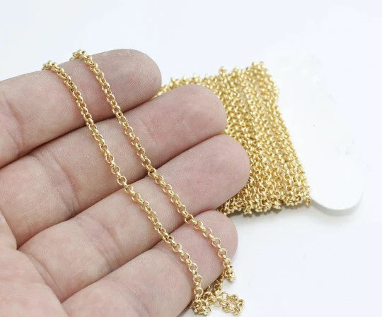 24 Carat Gold Plated Soldered Small Roll Chain. Dimensions: 2.4 mm PRICE FOR 1 METER. 24 Carat gold plated on brass. A Quality product resistant to rust and tarnishing. Do not contact with chemicals and perfumes for long-term use. Passed all tests does not contain harmful materials. Colors may vary depending on screen settings and ambient light.