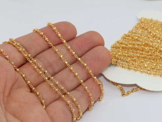 24 Carat Gold Plated Soldered Ball Chain. Dimensions: 2.5 mm PRICE FOR 1 METER. 24 Carat gold plated on brass. A Quality product resistant to rust and tarnishing. Do not contact with chemicals and perfumes for long-term use. Passed all tests does not contain harmful materials. Colors may vary depending on screen settings and ambient light.