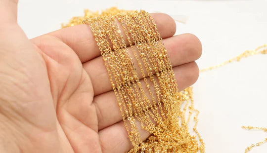 24 Carat Gold Plated Soldered Ball Link Chain. Dimensions: 1.5x2mm PRICE FOR 1 METER. 24 Carat gold plated on brass. A Quality product resistant to rust and tarnishing. Do not contact with chemicals and perfumes for long-term use. Passed all tests does not contain harmful materials. Colors may vary depending on screen settings and ambient light.