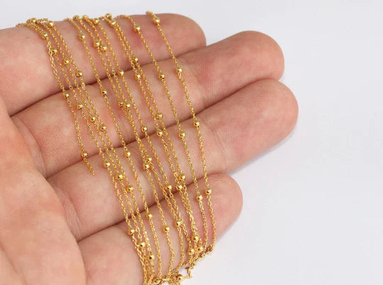 24 Carat Gold Plated 2mm Soldered Ball Satellite Chain. Dimensions: 2mm PRICE FOR 1 METER. 24 carat gold plated on brass. A Quality product resistant to rust and tarnishing. Do not contact with chemicals and perfumes for long-term use. Passed all tests does not contain harmful materials. Colors may vary depending on screen settings and ambient light.