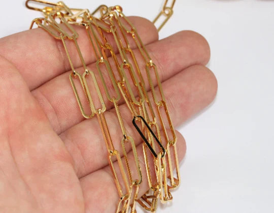 24 Carat Gold Plated Large Paperclip Chain. Dimensions: 5x20mm PRICE FOR 1 METER. 24 Carat gold plated on brass. A Quality product resistant to rust and tarnishing. Do not contact with chemicals and perfumes for long-term use. Passed all tests does not contain harmful materials. Colors may vary depending on screen settings and ambient light.