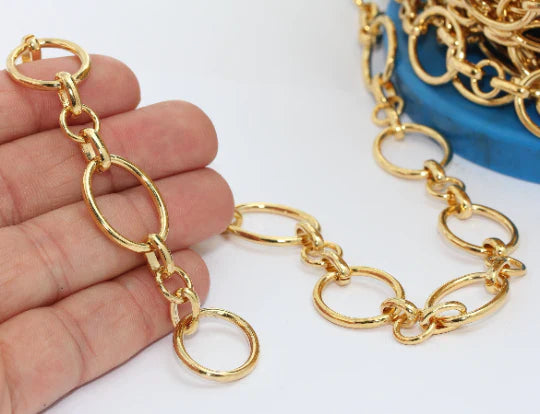 24 Carat Gold Plated Handmade Link Chain. Dimensions: 17.5x23mm PRICE FOR 1 METER. 24 Carat gold plated on brass. A Quality product resistant to rust and tarnishing. Do not contact with chemicals and perfumes for long-term use. Passed all tests does not contain harmful materials. Colors may vary depending on screen settings and ambient light.