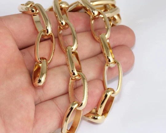 24 Carat Gold Plated Handmade Oval Paperclip Chain. Dimensions: 14x25mm PRICE FOR 1 METER. 24 Carat gold plated on brass. A Quality product resistant to rust and tarnishing. Do not contact with chemicals and perfumes for long-term use. Passed all tests does not contain harmful materials. Colors may vary depending on screen settings and ambient light.
