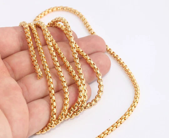 24 Carat Gold Plated Soldered Box Chain. Dimensions: 4mm PRICE FOR 1 METER. 24 Carat gold plated on brass. A Quality product resistant to rust and tarnishing. Do not contact with chemicals and perfumes for long-term use. Passed all tests does not contain harmful materials. Colors may vary depending on screen settings and ambient light.