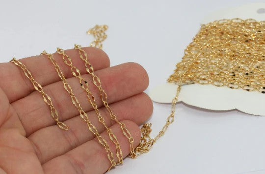 24 Carat Gold Plated Soldered Oval Chain. Dimensions: 3.5x7mm PRICE FOR 1 METER. 24 Carat gold plated on brass. A Quality product resistant to rust and tarnishing. Do not contact with chemicals and perfumes for long-term use. Passed all tests does not contain harmful materials. Colors may vary depending on screen settings and ambient light.