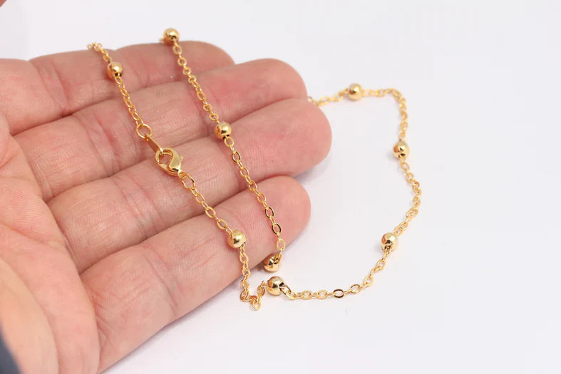 24K Gold Plated Shiny, 4mm Ball Beaded Ready Chain. Dimensions: 2x2.5mm Price is per piece. 24K gold plated on brass. A Quality product, resistant to rust and tarnishing. Do not contact with chemicals and perfumes for long-term use. Passed all tests, does not contain harmful materials. Colors may vary depending on screen settings and ambient light.