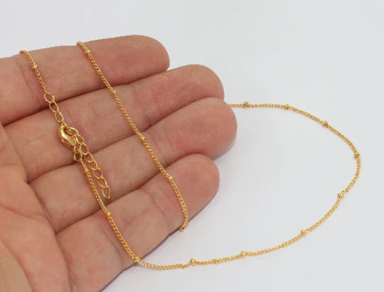 24K Gold Plated Shiny, 45+3cm, Thin Satellite Chain. Dimensions: 1.2mm - Price per piece. 24K gold plated on brass. A Quality product, resistant to rust and tarnishing. Do not contact with chemicals and perfumes for long-term use. Passed all tests, does not contain harmful materials. Colors may vary depending on screen settings and ambient light.