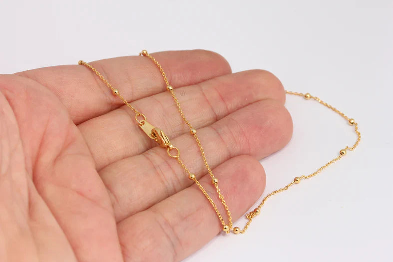 24K Gold Plated Shiny, 45cm, Bulk Thin Satellite Ready Chain. Ball Size: 2mm Chain Thickness: 1mm - Price per piece. 24K gold plated on brass. A Quality product, resistant to rust and tarnishing. Do not contact with chemicals and perfumes for long-term use. Passed all tests, does not contain harmful materials. Colors may vary depending on screen settings and ambient light.