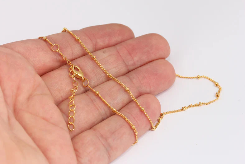 24K Gold Plated Shiny, 50cm, Bulk Thin Satellite Ready Chain. Ball Size: 2.2mm Dimensions: 1.3mm Price is per piece. 24K gold plated on brass. A Quality product, resistant to rust and tarnishing. Do not contact with chemicals and perfumes for long-term use. Passed all tests, does not contain harmful materials. Colors may vary depending on screen settings and ambient light.