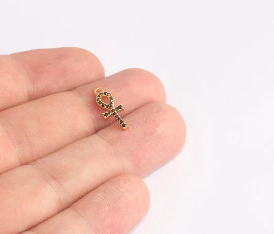 24 carat gold plated black zircon stone shiny ankh key of the nile charms ankh key of the nile pendant. dimensions: 7x17mm price is per piece. 24 carat gold plated brass. A quality product resistant to rust and tarnishing. for long-term use do not contact with chemicals and perfumes. passed all tests does not contain harmful materials. colors may vary depending on screen settings and ambient light.