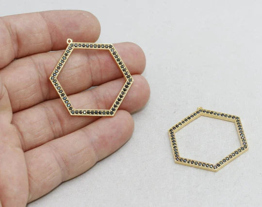 24 Carat Gold Plated Black Zircon Stone Shiny Hexagon Charms Hexagon Pendant. Dimensions: 32 mm Price is per piece. 24 carat gold plated on brass. A Quality product resistant to rust and tarnishing. Do not contact with chemicals and perfumes for long-term use. Passed all tests does not contain harmful materials. Colors may vary depending on screen settings and ambient light.
