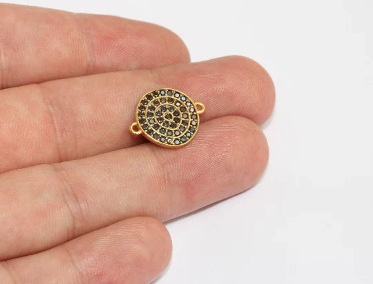 24 Carat Gold Plated Black Zircon Stone Shiny Round Charms Round Pendant. Dimensions: 14x20mm Price is per piece. 24 carat gold plated on brass. A Quality product resistant to rust and tarnishing. Do not contact with chemicals and perfumes for long-term use. Passed all tests does not contain harmful materials. Colors may vary depending on screen settings and ambient light.