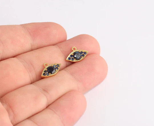 24 Carat Gold Plated Black Zircon Stone Shiny Eye Charms Eye Pendant. Dimensions: 9x14mm Price is per piece. 24 carat gold plated on brass. A Quality product does not rust or tarnish. Do not contact with chemicals and perfumes for long-term use. Passed all tests does not contain harmful materials. Colors may vary depending on screen settings and ambient light.