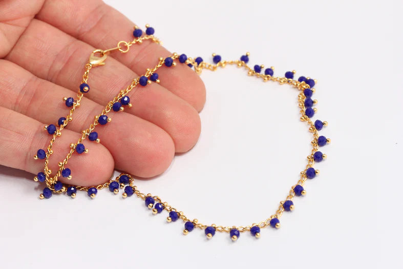 24K Gold Plated Shiny, 45cm, Blue Beaded Dangling Ready Chain. Dimensions: 1.3mm - Price per piece. 24K gold plated on brass. A Quality product, resistant to rust and tarnishing. Do not contact with chemicals and perfumes for long-term use. Passed all tests, does not contain harmful materials. Colors may vary depending on screen settings and ambient light.