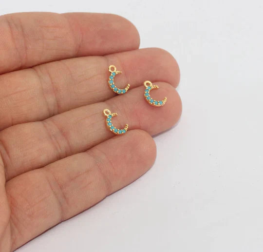 24K Gold Plated Blue Zircon Stone Gold Moon Charms Moon Pendant. Dimensions: 7x10mm Price is per piece. 24K gold plated on brass. A Quality product does not rust or tarnish. Do not contact with chemicals and perfumes for long-term use. Passed all tests does not contain harmful materials. Colors may vary depending on screen settings and ambient light.