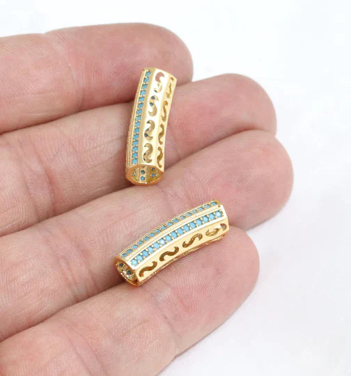 24K Gold Plated Blue Zircon Stone Shiny Pipe Charms Pipe Pendant. Dimensions: 7x22mm Price is per piece. 24K gold plated on brass. A Quality product resistant to rust and tarnishing. Do not contact with chemicals and perfumes for long-term use. Passed all tests does not contain harmful materials. Colors may vary depending on screen settings and ambient light.