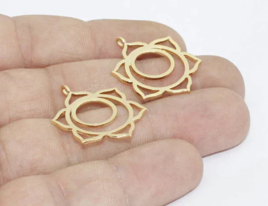 24 Carat Gold Plated Chakra Charms Chakra Yoga Pendant. Dimensions: 21x28mm Price is per piece. 24 carat gold plated on brass. A Quality product resistant to rust and tarnishing. Do not contact with chemicals and perfumes for long-term use. Passed all tests does not contain harmful materials. Colors may vary depending on screen settings and ambient light.