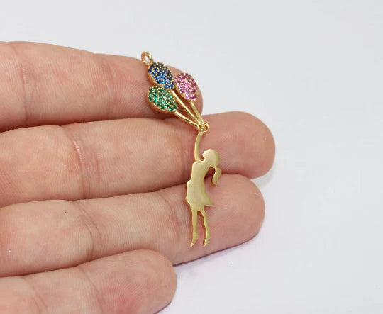24K Gold Plated Colorful Zircon Stone Shiny Balloon Girl Charms Balloon Girl Pendant. Dimensions: 15x55mm Price is per piece. 24K gold plated on brass. A Quality product resistant to rust and tarnishing. Do not contact with chemicals and perfumes for long-term use. Passed all tests does not contain harmful materials. Colors may vary depending on screen settings and ambient light.