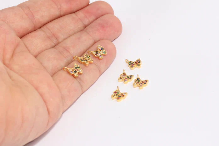 24K Gold Plated Colorful Zircon Stone Shiny Butterfly Charms Butterfly Pendant. Dimensions: 8x9mm Price is per piece. 24K gold plated on brass. A Quality product does not rust or tarnish. Do not contact with chemicals and perfumes for long-term use. Passed all tests does not contain harmful materials. Colors may vary depending on screen settings and ambient light.