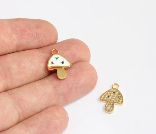 24K Gold Plated Colorful Zircon Stone Mushroom Charms Mushroom Pendant. Dimensions: 13x18mm Price is per piece. 24K gold plated on brass. A Quality product does not rust or tarnish. For long-term use do not contact with chemicals and perfumes. Passed all tests does not contain harmful materials. Colors may vary depending on screen settings and ambient light.