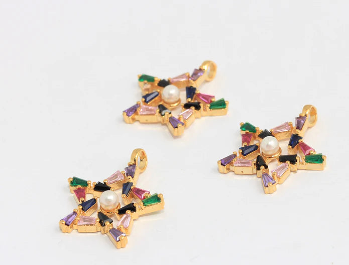 24K Gold Plated Colorful Zircon Stone Shiny Pearl Star Charms Pearl Star Pendant. Dimensions: 18x21mm Price is per piece. 24K gold plated on brass. A Quality product resistant to rust and tarnishing. Do not contact with chemicals and perfumes for long-term use. Passed all tests does not contain harmful materials. Colors may vary depending on screen settings and ambient light.