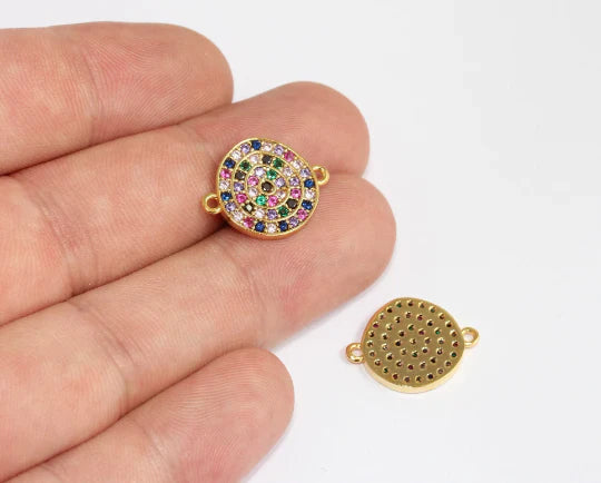 24K Gold Plated Colorful Zircon Stone Shiny Round Charm Round Pendant. Dimensions: 15x19mm Price is per piece. 24K gold plated on brass. A Quality product resistant to rust and tarnishing. Do not contact with chemicals and perfumes for long-term use. Passed all tests does not contain harmful materials. Colors may vary depending on screen settings and ambient light.