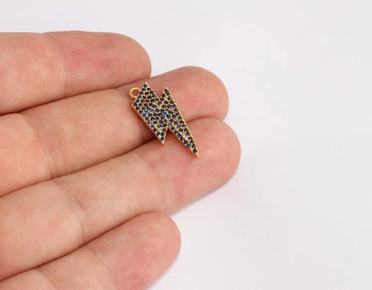 24 Carat Gold Plated Dark Blue Zircon Stone Shiny Lightning Charms Lightning Pendant. Dimensions: Back Price per piece. 24 carat gold plated on brass. A Quality product resistant to rust and tarnishing. Do not contact with chemicals and perfumes for long-term use. Passed all tests does not contain harmful materials. Colors may vary depending on screen settings and ambient light.