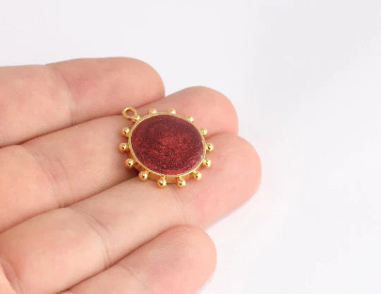 24K Gold Plated Dark Red Zircon Stone Shiny Round Charms Round Pendant. Dimensions: 22mm Price is per piece. 24K gold plated on brass. A Quality product resistant to rust and tarnishing. Do not contact with chemicals and perfumes for long-term use. Passed all tests does not contain harmful materials. Colors may vary depending on screen settings and ambient light.