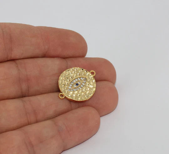 24K Gold Plated Double Handle White Zircon Stone Hammered Shiny Eye Medallion Charms Eye Medallion Pendant. Dimensions: 18x24mm Price is per piece. 24K gold plated on brass. A Quality product resistant to rust and tarnishing. Do not contact with chemicals and perfumes for long-term use. Passed all tests does not contain harmful materials. Colors may vary depending on screen settings and ambient light.