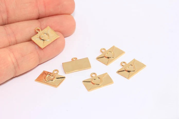 24 Carat Gold Plated Envelope Charm Heart Letter Envelope Pendant. Dimensions: 10x17mm Price is per piece. 24 carat gold plated on brass. A Quality product resistant to rust and tarnishing. Do not contact with chemicals and perfumes for long-term use. Passed all tests does not contain harmful materials. Colors may vary depending on screen settings and ambient light.