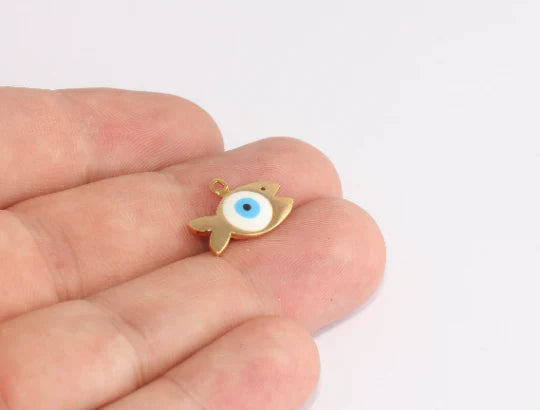 24 Carat Gold Plated Evil Eye Bead Enameled Fish Charm. Dimensions: 13x17mm. Package price. There are 3 products in 1 package. 24 Carat gold plated on brass. A Quality product resistant to rust and tarnishing. Do not contact with chemicals and perfumes for long-term use. Passed all tests does not contain harmful materials. Colors may vary depending on screen settings and ambient light.