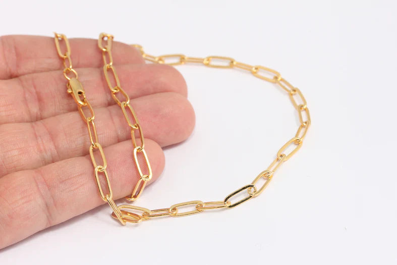 24K Gold Plated Shiny, 40cm, Oval Flat Paperclip Ready Chain. Dimensions: 4.2x11mm Price is per piece. 24K gold plated on brass. A Quality product, resistant to rust and tarnishing. Do not contact with chemicals and perfumes for long-term use. Passed all tests, does not contain harmful materials. Colors may vary depending on screen settings and ambient light.