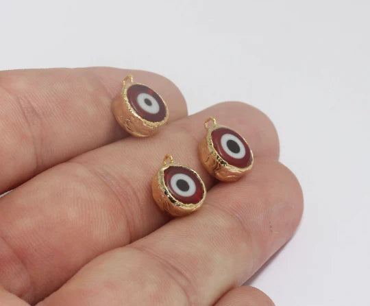 24 Carat Gold Plated Framed Red Evil Eye Bead. Dimensions: 11mm Price is per piece. 24 carat gold plated on brass. A Quality product resistant to rust and tarnishing. For long-term use do not contact with chemicals and perfumes. Passed all tests does not contain harmful materials. Colors may vary depending on screen settings and ambient light.