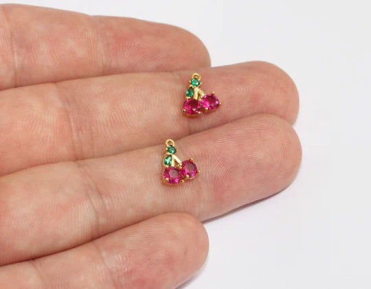 24K Gold Plated Green Pink Zircon Stone Shiny Cherry Charms Cherry Pendant. Dimensions: 8.5x10mm Price is per piece. 24K gold plated on brass. A Quality product does not rust or tarnish. Do not contact with chemicals and perfumes for long-term use. Passed all tests does not contain harmful materials. Colors may vary depending on screen settings and ambient light.