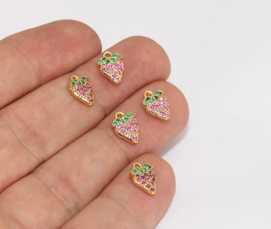 24K Gold Plated Green Pink Zircon Stone Shiny Strawberry Charms Strawberry Pendant. Dimensions: 7x10mm Price is per piece. 24K gold plated on brass. A Quality product does not rust or tarnish. Do not contact with chemicals and perfumes for long-term use. Passed all tests does not contain harmful materials. Colors may vary depending on screen settings and ambient light.