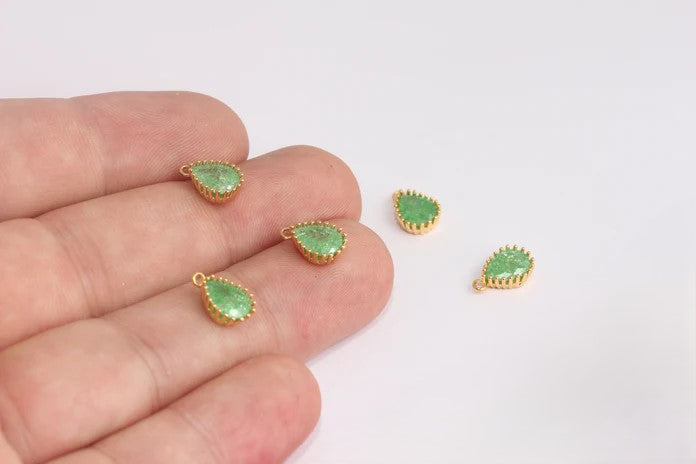 24 Carat Gold Plated Green Zircon Stone Drop Charms Drop Pendant. Dimensions: 6.5x10mm Price is per piece. 24 carat gold plated on brass. A Quality product does not rust or tarnish. Do not contact with chemicals and perfumes for long-term use. Passed all tests does not contain harmful materials. Colors may vary depending on screen settings and ambient light.
