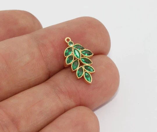 24K Gold Plated Green Zircon Stone Shiny Leaf Charms Leaf Pendant. Dimensions: 11x19mm Price is per piece. 24K gold plated on brass. A Quality product resistant to rust and tarnishing. Do not contact with chemicals and perfumes for long-term use. Passed all tests does not contain harmful materials. Colors may vary depending on screen settings and ambient light.