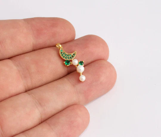 24K Gold Plated Green Zircon Stone Shiny Pearl Moon Charms Pearl Moon Pendant. Dimensions: 12x25mm Price is per piece. 24K gold plated on brass. A Quality product resistant to rust and tarnishing. Do not contact with chemicals and perfumes for long-term use. Passed all tests does not contain harmful materials. Colors may vary depending on screen settings and ambient light.