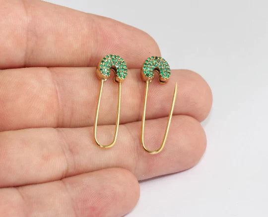 24 Carat Gold Plated Green Zircon Stone Shiny Safety Pin Earrings Safety Pin Earrings. Dimensions: 10x32mm Price is per piece. 24 carat gold plated on brass. A Quality product resistant to rust and tarnishing. Do not contact with chemicals and perfumes for long-term use. Passed all tests does not contain harmful materials. Colors may vary depending on screen settings and ambient light.