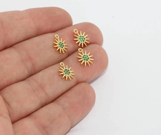 24 Carat Gold Plated Green Shiny Zircon Stone Sun Pendant. Dimensions: 9x11mm Price is per piece. 24 carat gold plated on brass. A Quality product does not rust or tarnish. For long-term use do not contact with chemicals and perfumes. Passed all tests does not contain harmful materials. Colors may vary depending on screen settings and ambient light.