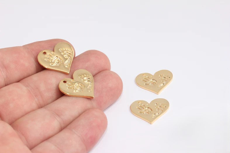 24 Carat Gold Plated Hand and Footprint Heart Pendant. Dimensions: 19x21mm Price is per piece. 24 carat gold plated on brass. A Quality product resistant to rust and tarnishing. Do not contact with chemicals and perfumes for long-term use. Passed all tests does not contain harmful materials. Colors may vary depending on screen settings and ambient light.