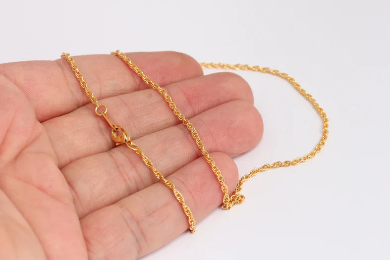 24K Gold Plated Shiny, 45cm, Interlocking Ring Ready Chain. Dimensions: 2mm Price is per piece. 24K gold plated on brass. A Quality product, resistant to rust and tarnishing. Do not contact with chemicals and perfumes for long-term use. Passed all tests, does not contain harmful materials. Colors may vary depending on screen settings and ambient light.