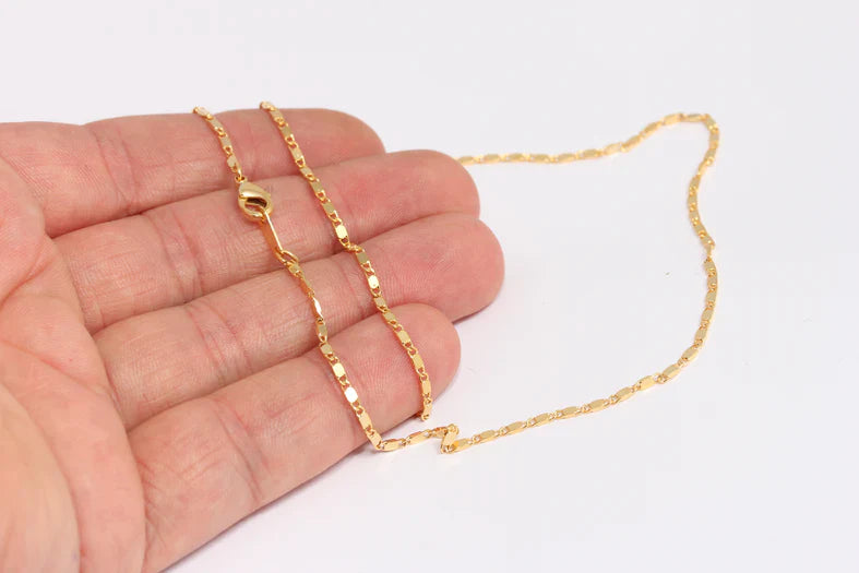 24K Gold Plated Shiny, 45cm, Jewelry Ready Chain. Dimensions: 1.7mm Price per piece. 24K gold plated on brass. A Quality product, resistant to rust and tarnishing. Do not contact with chemicals and perfumes for long-term use. Passed all tests, does not contain harmful materials. Colors may vary depending on screen settings and ambient light.