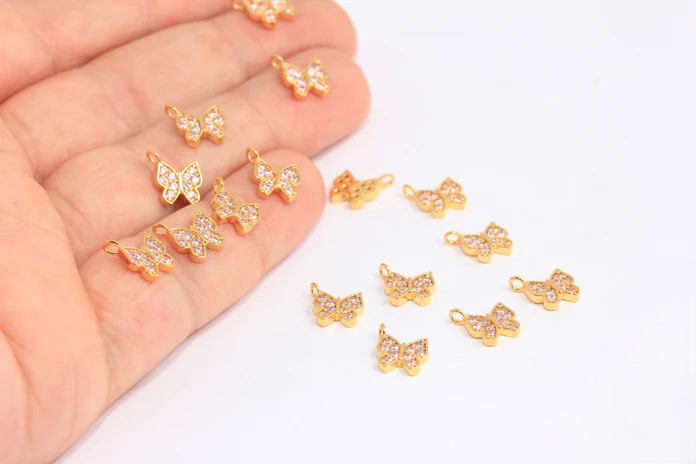 24K Gold Plated Light Pink Zircon Stone Shiny Butterfly Charms Butterfly Pendant. Dimensions: 8mm Price is per piece. 24K gold plated on brass. A Quality product does not rust or tarnish. Do not contact with chemicals and perfumes for long-term use. Passed all tests does not contain harmful materials. Colors may vary depending on screen settings and ambient light.