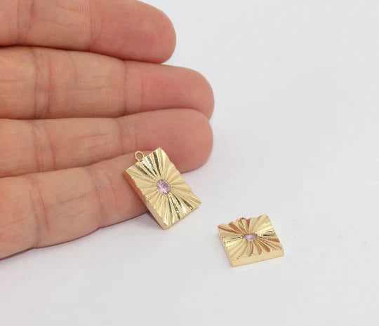 24K Gold Plated Light Pink Zircon Stone Shiny Square Charms Square Pendant. Dimensions: 13x20mm Price is per piece. 24K gold plated on brass. A Quality product resistant to rust and tarnishing. Do not contact with chemicals and perfumes for long-term use. Passed all tests does not contain harmful materials. Colors may vary depending on screen settings and ambient light.