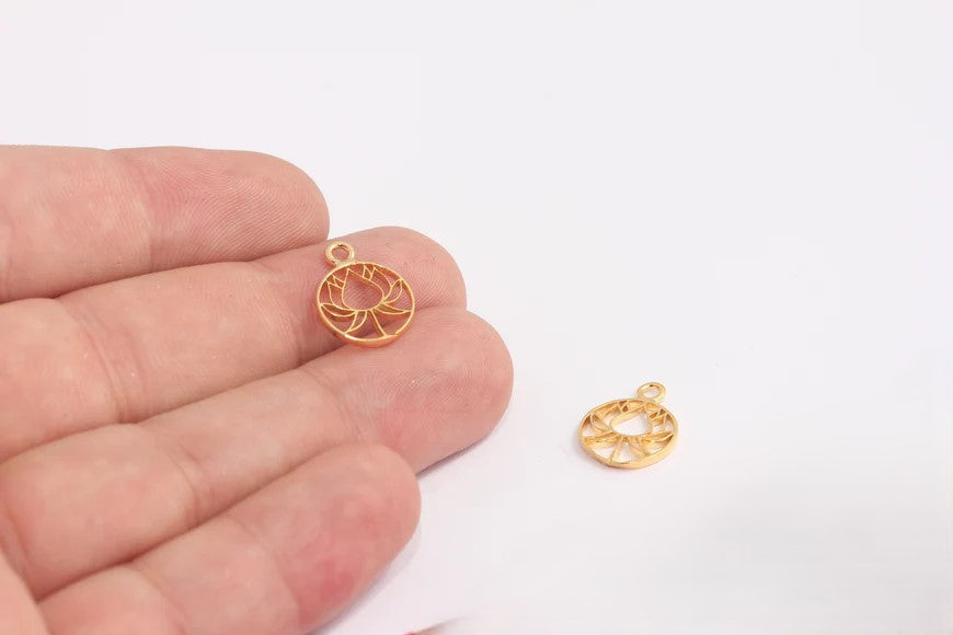 Shiny Gold Plated Lotus Flower Pendant Dimensions: 12x15mm Price is per piece. 24 carat gold plated on brass. A quality product resistant to rust and tarnishing. Do not contact with chemicals and perfumes for long-term use. It has passed all tests and does not contain materials harmful to health. Colors may vary depending on screen settings and ambient light.