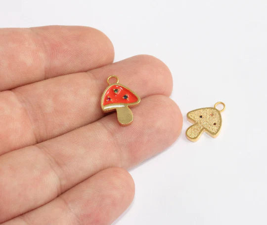 24K Gold Plated Orange Enameled Mushroom Charms Mushroom Pendant. Dimensions: 13x18mm. Package price. There are 5 products in 1 package. Brass is 24K gold plated. A Quality product resistant to rust and tarnishing. For long-term use do not contact with chemicals and perfumes. Passed all tests does not contain harmful materials. Colors may vary depending on screen settings and ambient light.