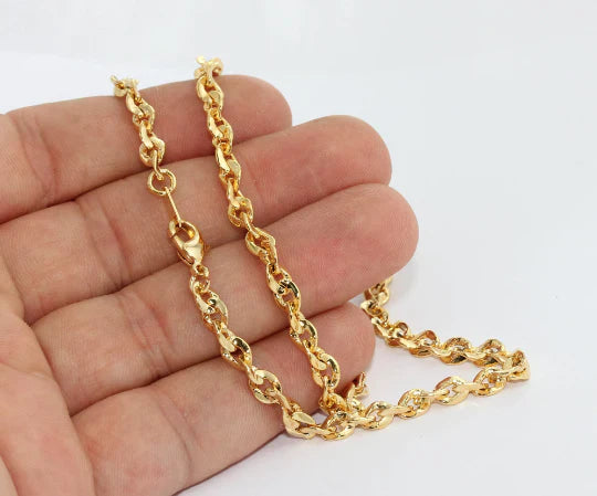 24 Carat Gold Plated Shiny, Oval Twisted Feset Ready Chain. Dimensions: 43cm, - Price per piece. 24 Carat gold plated on brass. A Quality product, resistant to rust and tarnishing. Do not contact with chemicals and perfumes for long-term use. Passed all tests, does not contain harmful materials. Colors may vary depending on screen settings and ambient light.